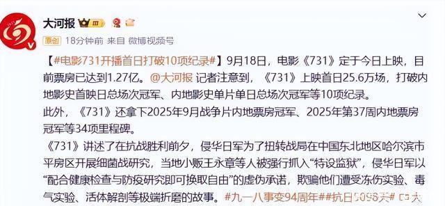 在票房疯涨的同时,731还创造了内地影坛的十项记录。 例如内地影史单片单日总场次冠军,首映日总场次冠军。 以及25年9月战争片内地票房冠军、25年第37周内地票房冠军等。